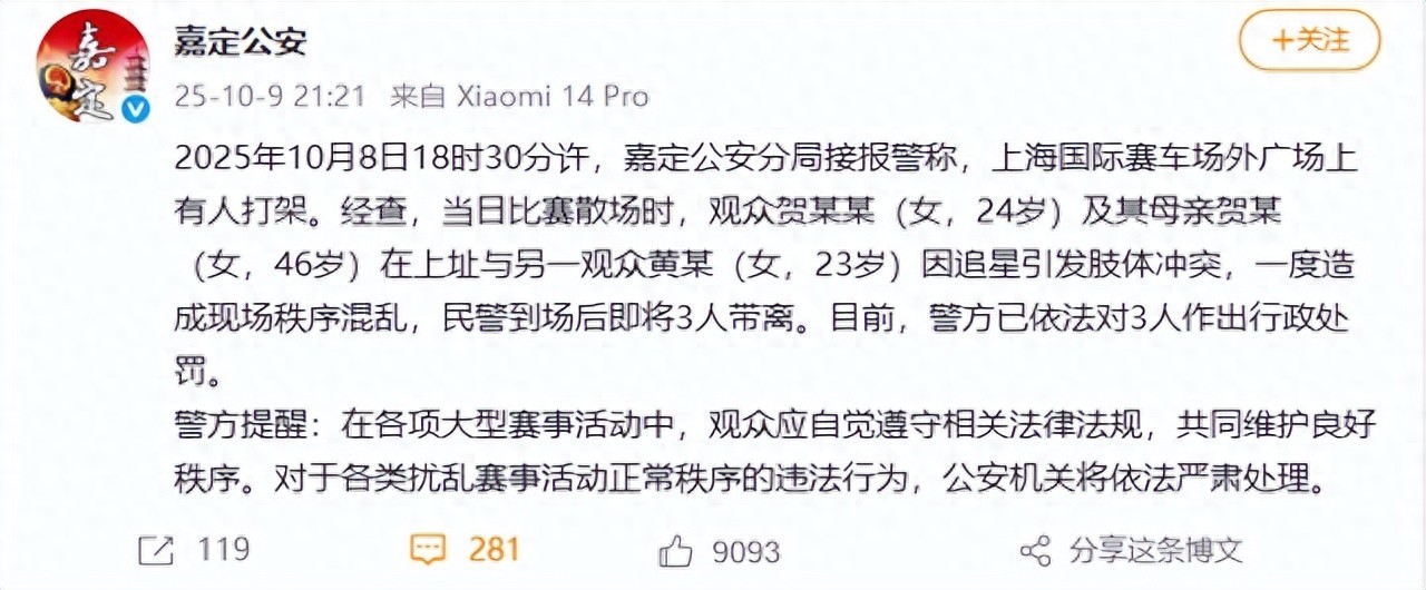2025年10月8日18时30分许,嘉定公安分局接报警称,上海国际赛车场外广场上有人打架。经查,当日比赛散场时,观众贺某某(女,24岁)及其母亲贺某(女,46岁)在上址与另一观众黄某(女,23岁)因追星引发肢体冲突,一度造成现场秩序混乱,民警到场后即将3人带离。目前,警方已依法对3人作出行政处罚。